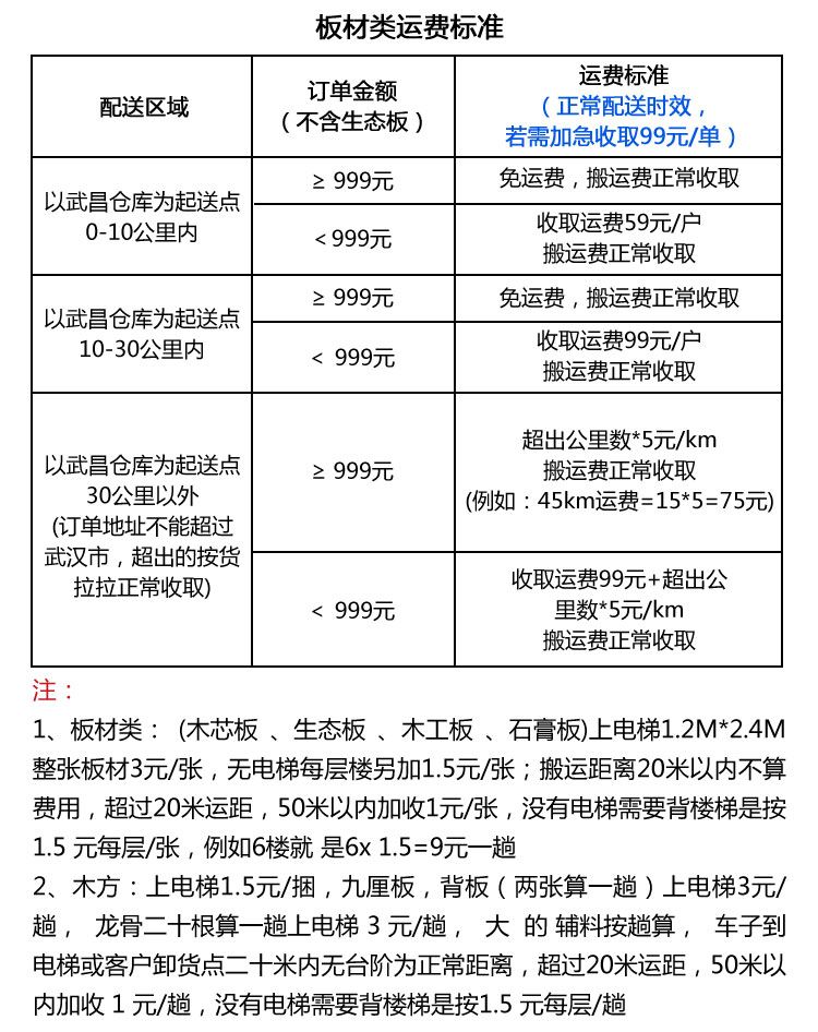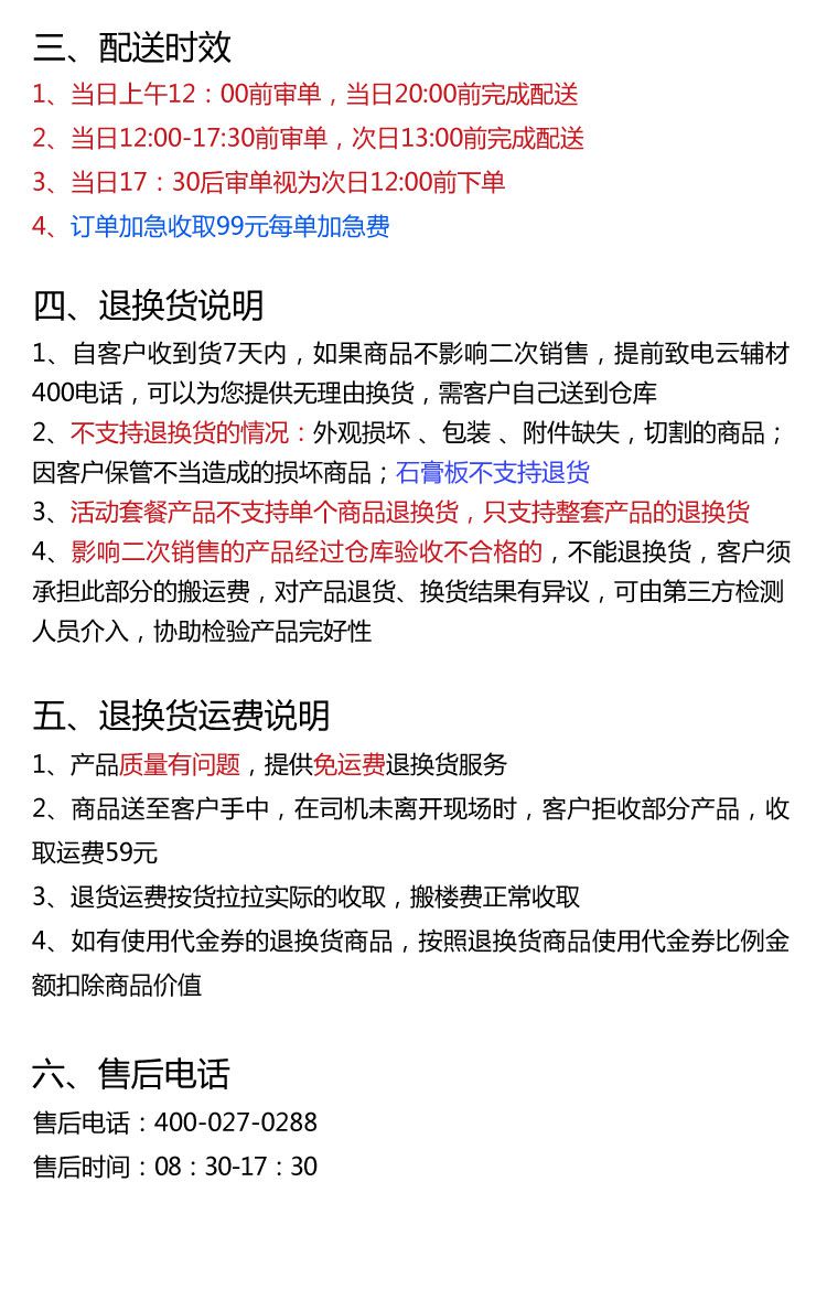 配送区域及收费标准 配送答疑 售后电话 1.请问如何联系到给我送货的快递员? 可以拨打云辅材平台400客服热线由我们帮您查询。 2.可以上门自提吗? 可以自提。云辅材 有白沙洲恒钢物流园和临空港两大仓库,可以就近自提,自提不会额外退运输费用。 3.可以指定时间段送货吗? 1.上午12:00前审单,下午20:30前完成配送 2.当日12:00-17:30前审单次日13:00前完成配送 3.当日17:30后审单,视为次日12:00前下单 4. 订单加急收取99元订单加急费用 4.配送地址可以修改吗? 可以。在货物发出前,发现地址填写错误,及时联系售后更改配送地址,可以免费修改配送地址,配送运费根据新的地址,多退少补。配送时效从更改地址的时间为下单时间开始计算。在货物发出途中和送达后,需要更改地址的,需另外再支付配送运费,配送时效从更改地址的时间为下单时间开始计算。 售后电话:400-027-0288